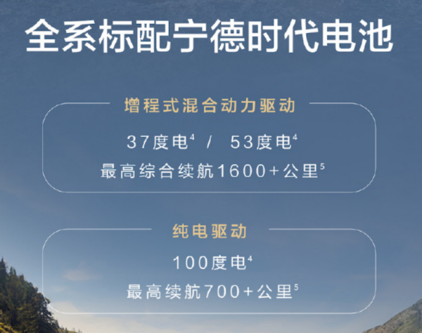 另外,全新问界M7全系标配宁德时代电池包。增程版采用1.5T四缸增程器+37/53kWh两种电池包,WLTC综合续航超1600km,同级最低油耗6.5L/100km;纯电版首发搭载华为高压七合一电驱和100度电池包,CLTC纯电续航700km+,支持4C高倍率快充。