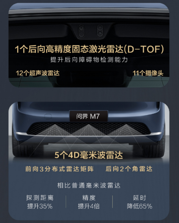 中高配版本将搭载与M8旗舰同款华为ADS4智能驾驶软硬件。车顶1颗192线激光雷达,搭配后向1颗高精度固态激光雷达、前向3颗分布式4D毫米波雷达矩阵、以及2颗4D毫米波角雷达,形成全向立体三维感知,不仅同级最强,更是行业领先。