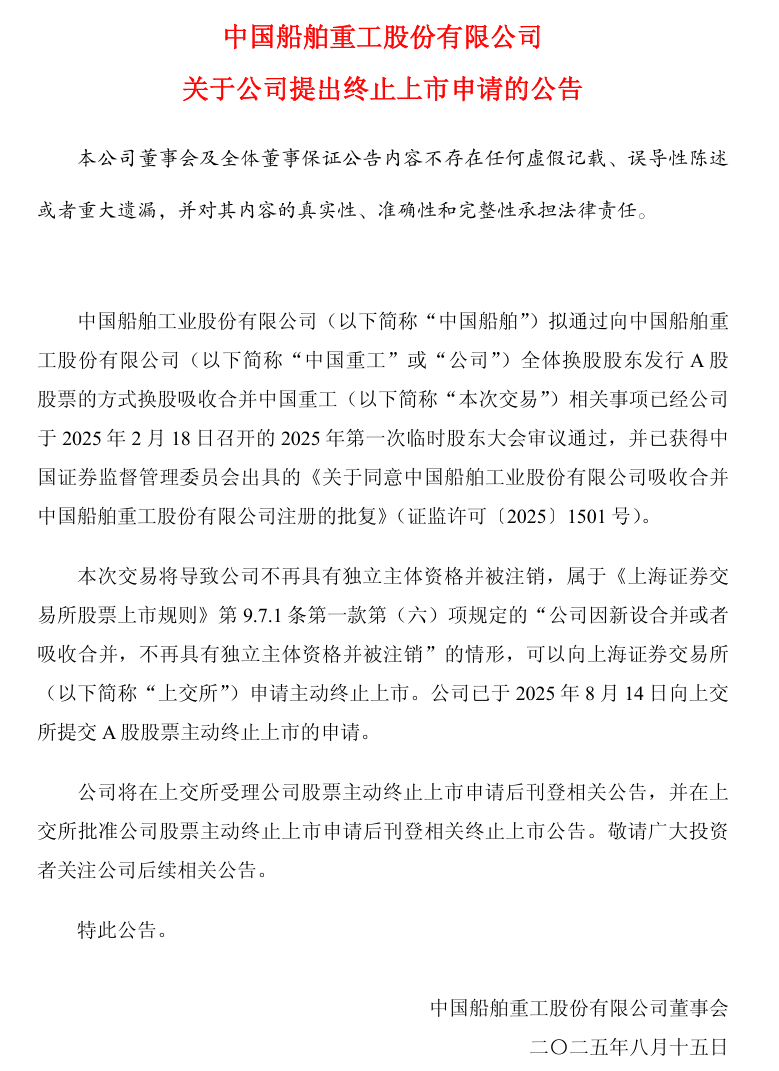 IT之家注意到,中国重工今日发布了关于主动终止上市的方案,中国船舶拟通过向中国重工全体换股股东发行 A 股股票的方式换股吸收合并中国重工相关事项,中国重工已经于 2025 年 2 月 18 日召开的 2025 年第一次临时股东大会审议通过,并已获得中国证券监督管理委员会出具的《关于同意中国船舶工业股份有限公司吸收合并中国船舶重工股份有限公司注册的批复》(证监许可〔2025〕1501 号)。